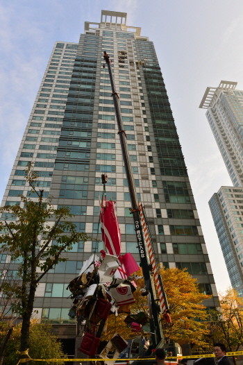 16일 오전 8시 55분께 서울 강남구 삼성동 현대아이파크 아파트에 한 민간 소형헬기가 충돌해 추락, 관계자들이 사고 잔해를 수습하고 있다.
