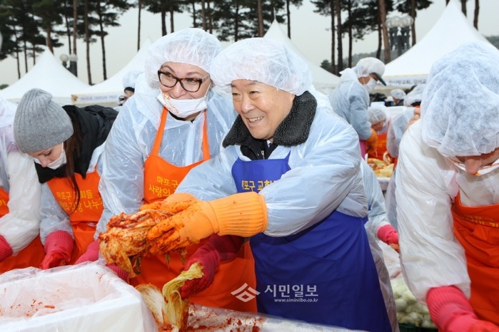 마포구와 마포구 교회연합회는 지난 14일 서울월드컵공원 평화의광장에서 '김장 나눔, 관광문화 축제'를 진행했다. 이 날 행사에는 40개 교회 종교인 400명과 외국인 관광객, 다문화가정 등 총 500여명이 모여 지역내 취약계층과 다문화가정에 전달될 김장김치 1만8000㎏을 만들었으며 사진은 박홍섭 마포구청장과 행사에 참여한 주민들이 김치를 담그는 모습.