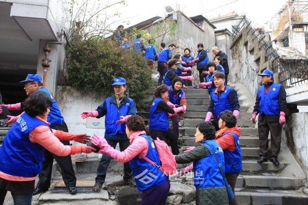 [시민일보]지난 15일 성동구 바르게살기운동협의회가 마장동, 금호2·3가동의 저소득층 7가구에 연탄 1500장과 지역내 총 51가구에 겨울용 이불을 전달했다. 사진은 금호2·3가동의 고지대 가구에 직접 연탄을 배달하는 협의회 회원들의 모습.
