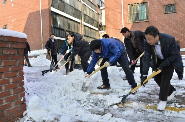 | ▲ 지난 2월4일 신정2동 주택가 인근 주민들이 함께 이면도로에 쌓인 눈을 치우고 있는 모습. | ||