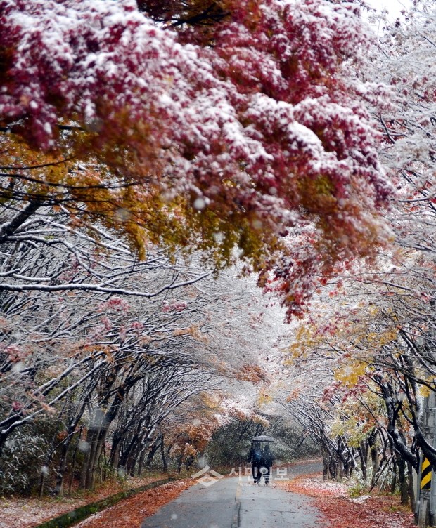 18일 오전 광주 무등산국립공원에 첫 눈이 내린 가운데 탐방객들이 눈을 맞으며 등산을 하고 있다. 이날 무등산에는 장불재와 서석대에 7㎝의 정도 눈이 내린 것으로 관측됐다.