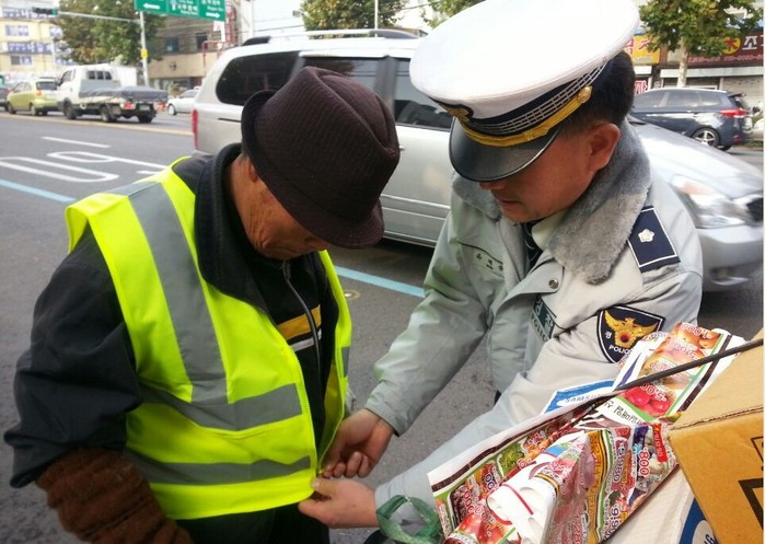 | ▲ 삼산서 직원이 노인에게 형광 조끼를 입혀주고 있다. | ||