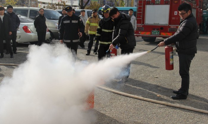 | ▲ 부평서 직원들이 소화기 분사 훈련을 하고 있다. | ||