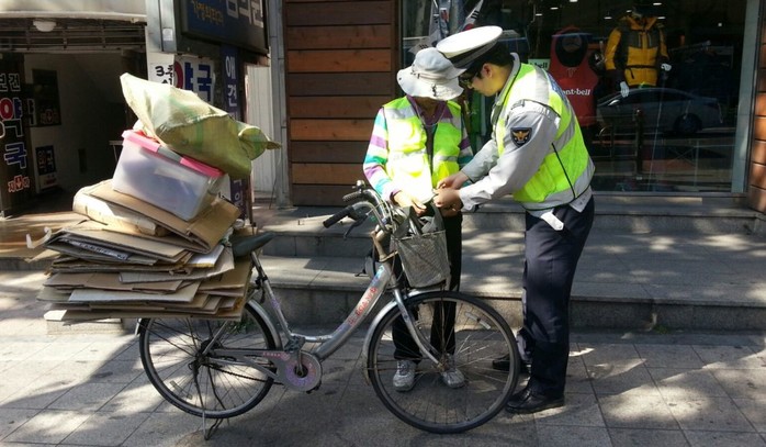 | ▲ 중부서 직원이 어르신에게 야광조끼를 입혀주고 있다. | ||