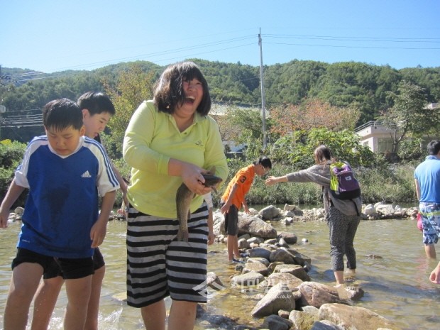 | ▲ 강동구지역의 발달장애아동과 그 가족들이 지난 10월 5일 양평 '외갓집 체험마을'을 방문해 심리 치유를 위한 힐링 캠프를 열었다. 사진은 부모님과 함께 송어잡이 체험을 하고 있는 장애아동들의 모습. | ||