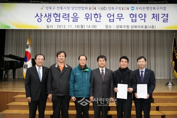 [시민일보]서울 성북구는 지난 18일 성북구청 아트홀에서 구 전통시장 상인연합회 및 지역내 우리은행 지점과 함께 대형마트와 SSM의 출현으로 어려움을 겪고 있는 전통시장을 살리고 이를 통해 지역경제 활성화를 위한 업무협약을 체결했다. 사진은 협약식 후 기념촬영하는 모습.