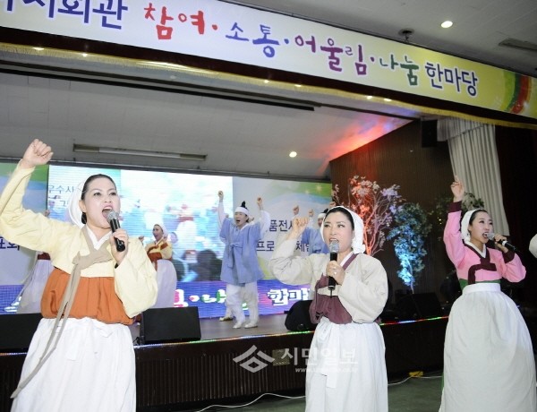 [시민일보]지난 20일 광진구가 구청 대강당에서 자치회관 프로그램 수강생 및 지역주민들이 참여한 가운데 '2013년 자치회관 우수사례 및 프로그램' 발표회를 열었다. 이날 행사에선 우수사례 발표와 함께 여러 체험부스가 운영됐다. 사진은 프로그램 발표 부문에서 최우수상을 수상한 군자동 자치회관의 '어촌마을 야단법석' 공연 모습.