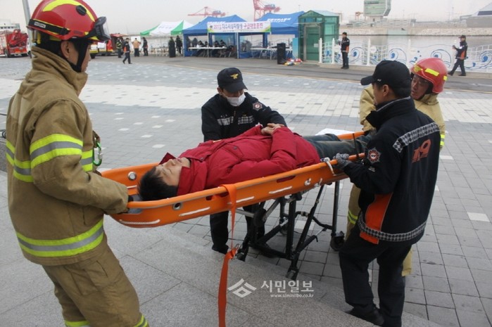 인천서부소방서는 지난 22일 서구 오류동 경인아라뱃길 여객터미널에서 한꺼번에 많은 환자가 발생할 경우를 대비해 세부적인 구급시스템 가동능력과 관계기관의 공조 역량을 강화하기위한 '2013년 다수사상자 발생 구급 대응훈련'을 실시했다. 사진은 폭탄테러로 건물붕괴와 화재발생으로 25명의 다수 사상자가 발생한 모의훈련중 들것으로 환자를 나르는 구급대원들