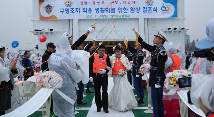 | ▲ 대형 경비함정 갑판에서 이색 결혼식이 진행되고 있다. | ||