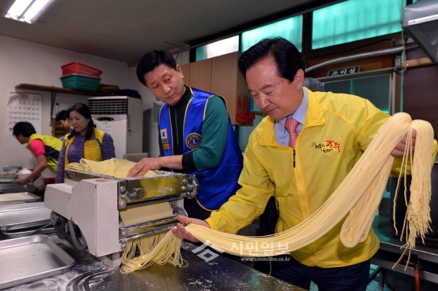 | ▲ 지난 10월 강운태 광주시장이 경로당에서 노인들을 위해 조리실에서 직접 제면기로 면을 뽑고있다. | ||