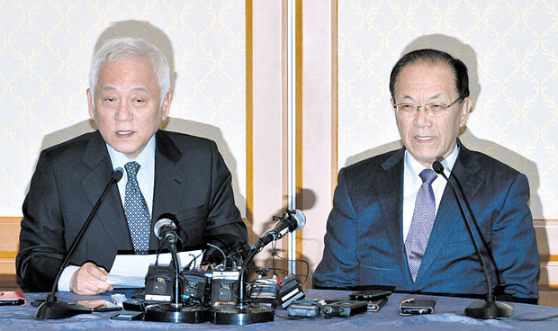 새누리당 황우여 대표와 민주당 김한길 대표가 25일 오후 서울 여의도 국회 귀빈식당에서 여야 대치 정국을 타개하고 국회 정상화를 모색하기 위한 회담을 갖고 있다.