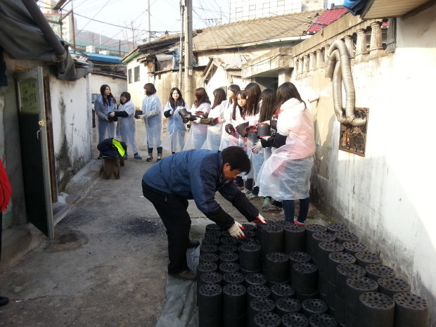 [시민일보]경기 의정부시 경민비즈니스고등학교 학생봉사단 30여명은 지난 23일 가능3동에서 차량이 진입할 수 없는 지역에 한 줄로 서서 릴레이식으로 홀몸노인 5세대의 연탄창고까지 연탄 1000장을 직접 전달했다. 사진은 행사에 참여한 배정임 선생님을 비롯한 학생봉사단 모습.