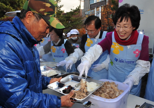 [시민일보]26일 서울 송파구 송파근린공원에서는 IBK기업은행의 사회공헌사업으로 1억2000만원을 들여 3.5톤 트럭을 개조한 'IBK 사랑의 밥차'에서 홀몸노인을 비롯한 어려운 이웃에 300인분의 식사를 대접하는 행사를 열었다. 사진은 노인들의 배식을 돕고 있는 박춘희 송파구청장의 모습.
