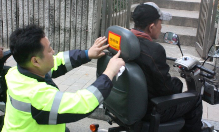 | ▲ 삼산서 직원이 전동휠체어에 야광 반사지를 부착하고 있다. | ||