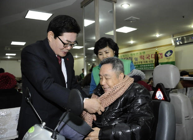 [시민일보]지난 26일 서울 광진구 새마을부녀회가 지역내 생활이 어려운 68세 이상 주민들을 대상으로 다문화 이주 여성들이 직접 만든 목도리를 전달하고 떡국을 대접했다. 사진은 주민에게 직접 목도리를 둘러주고 있는 김기동 광진구청장의 모습.