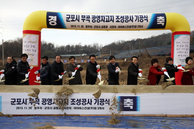 지난 26일 경기 군포시는 내년 11월 준공을 목표로 부곡동 880번지 일대에 총 200억원(도비 31.2%)을 들여 일반버스 136대, 소형마을버스 34대 등 모두 170대의 주차 능력을 갖춘 2만3500㎡ 규모의 공영차고지 기공식을 했다. 사진은 공영차고지 기공식 모습.