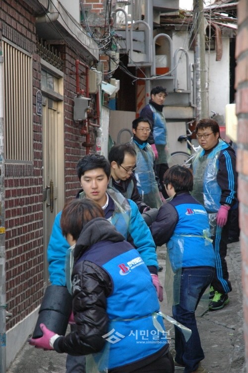 지난 29일 서울 성동구 마장동에서 반석정밀공업의 후원으로 ‘이웃돕기 사랑의 연탄 나르기’ 행사가 열렸다. 이날 행사에서는 반석정밀 직원 30여명이 참여해 마장동의 저소득층 4가구에 총 800장의 연탄을 전달했다. 사진은 각 가구로 연탄을 배달하는 반석정밀 직원들의 모습.