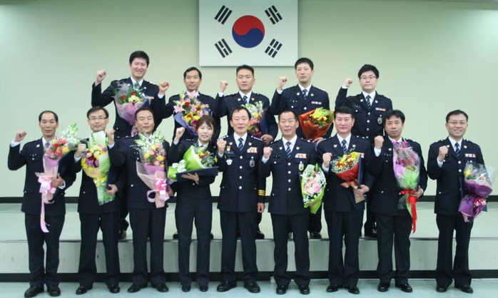 | ▲ 승진 임용식 참가자들이 기념촬영을 하고 있다. | ||