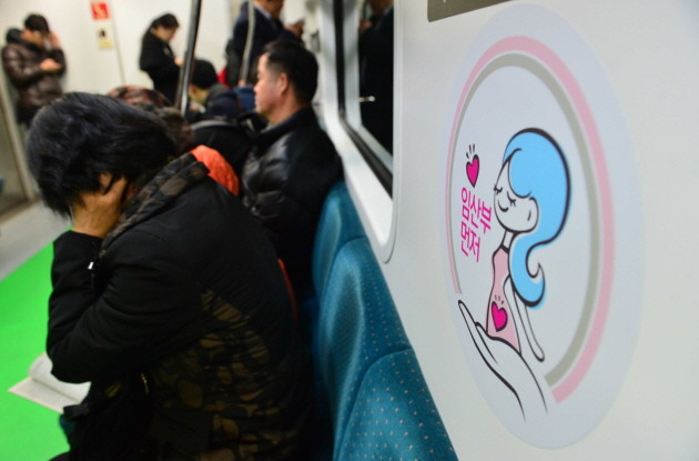 서울시는 2일부터 지하철 1~8호선 열차 1칸에 2석을 '임산부 배려석'으로 운영한다고 1일 밝혔다. 2일 오전 서울 지하철 3호선 열차 '교통약자 배려석' 끝에 임산부 배려석 스티커가 부착돼 있다.