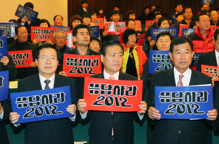 서울 송파구의회 박용모 의장은 지난 3일 국회도서관 대강당에서 2012년 대선 공약이었던 기초선거 정당공천제 폐지에 응답하라는 뜻의 ‘응답하라 2012’가 적힌 피켓을 들어 보이는 퍼포먼스를 벌였다. 사진은 피켓을 들고 있는 박 의장(가운데)의 모습.