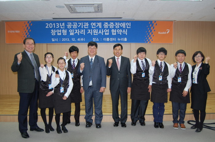 경기도광주하남교육지원청은 장애인 일자리 창출을 위해 4일 서울시 여의도 이룸센터에서 한국장애인개발원과 "공공기관 연계 중증장애인 창업형 장애인 일자리 지원사업" 협약을 맺었다. 사진은 광주하남교육지원청에 새로 연 "꿈앤카페"에 고용된 장애인 6명과 교육지원청 관계자들이 기념촬영을 하는 모습.