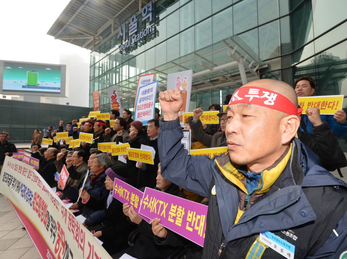4일 오전 서울 중구 봉래동 서울역사 앞에서 철도 민영화 반대 각계 원탁회의를 마친 시민사회단체와 국회의원, 종교계·학계 인사 등 참가자들이 ‘철도파업예고에 따른 기자회견’을 하고 있다. 철도노조는 “철도 분할 민영화 첫 단추인 수서 KTX노선을 분할하는 철도공사 이사회가 10일 개최된다. 이에 12월9일 오전 9시 총파업에 돌입하겠다”고 예고했다.