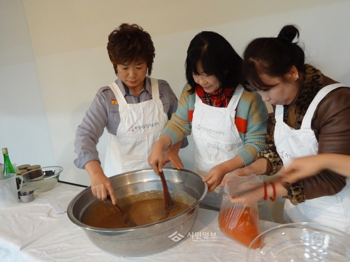 [시민일보]경기 화성시농업기술센터는 지난 6일 농업기술센터 강당에서 '엄마표 고추장 담그기' 강좌를 열었다. 이날 우송대학교 신미경 교수가 100여명의 주부들에게 한국 전통 고추장의 우수성과 장 담그기 비법, 베란다에서의 고추장 관리 요령 등을 강의했다. 사진은 장 담그기를 배우고 있는 참석자들의 모습.