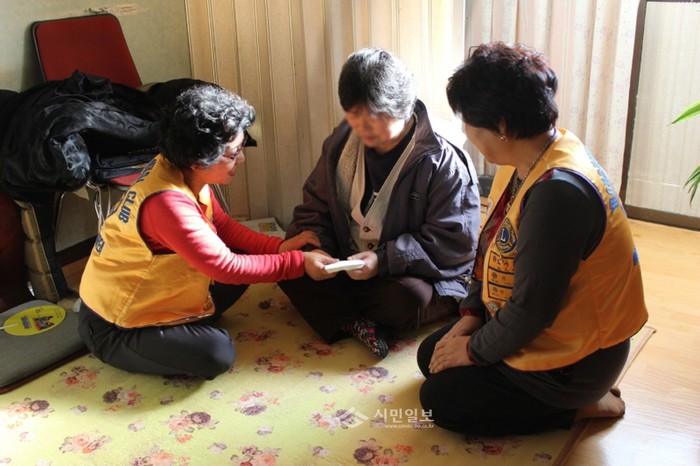 [시민일보]지난 6일 경기 연천온골라이온스클럽은 지난 10월30일 전곡역 앞 광장에서 개최한 바자회의 수익금으로 지역내 불우 암 환자 5명에게 수술비를 지원했다. 사진은 암 환자에게 수술비를 전달하는 클럽 회원들의 모습.