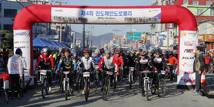 전남 진도군에서 지난 7~8일 자전거타기 붐 조성으로 환경오염 예방 및 삶의 질 향상을 도모하기 위해 열린 '제4회 진도해안도로 자전거 랠리'에 약 1500여명이 참가해 성황리에 마쳤다. 자전거 랠리는 진도읍사거리에서 운림산방~벽파항~진도대교~쉬미항을 거쳐 진도공설운동장으로 돌아오는 코스로 진행됐다. 사진은 대회 참가자들이 신호에 맞춰 출발하는 모습.