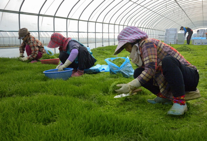 10일 오전 전남 해남군 문내 예락마을 김경수씨 시설하우스에서 세발나물을 수확하는 아낙들의 손길이 바쁘다.