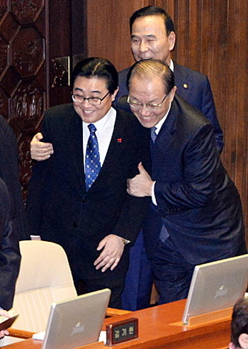 새누리당 황우여 대표가 10일 오후 서울 여의도 국회에서 열린 320회 국회(정기회) 17차 본회의에서 민주당 전병헌 원내대표의 어깨를 감싸고 있다.