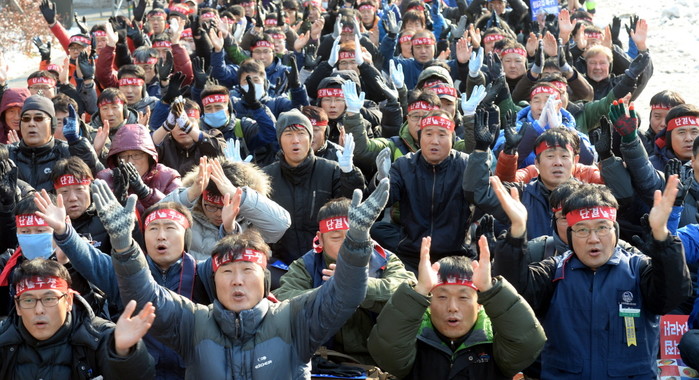 서울 지하철 1~4호선을 운영하는 서울메트로의 제1노조인 서울지하철노동조합 조합원들이 11일 오후 서울 중구 태평로1가 시청 서편에서 2013 임단협 파업투쟁 결의대회를 하고 있다.이들은 퇴직수당 폐지에 따른 임금 손실분 중 적정액을 보전해 줄 것과 4급 미만 하위직급의 승진, 정년 60세 회복 등을 주장했다.