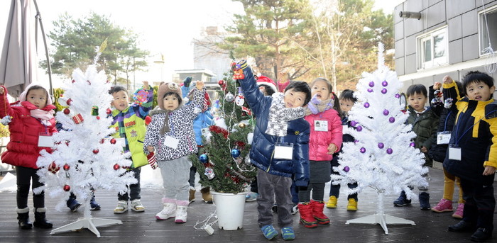 지난 10일 광진구 화양동 주민센터의 느티카페 앞에서 '쓰레기 제로화 홍보관' 개관을 기념해 종이컵, 캔, 플라스틱 등 재활용품을 활용한 '재활용 크리스마스 트리' 만들기 행사가 열렸다. 사진은 어린이들이 재활용품으로 만든 장식품을 크리스마스 트리에 장식하는 모습.