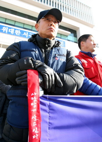 2일 오전 광주 서구청 앞에서 서구 재활용·대형폐기물 민간 위탁업체 근로자들과 공공운수노조 광주전남지부 노조원 30여명이 총파업 투쟁 선포 기자회견을 가졌다. 근로자들이 서구에 민간위탁업체와의 계약 해지를 촉구하고 있다.