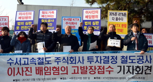 12일 오전 서울 서초동 서울중앙지검 앞에서 진행된 '수서발 KTX 운영 주식회사 출자' 의결을 한 한국철도공사 이사진에 대한 배임혐의 고발 기자회견에서 전국철도노조 박태만 수석부위원장과 노조원 및 KTX 민영화 저지 범대위 관계자들이 기자회견을 갖고 구호를 외치고 있다. 노조 측은 기자회견문을 통해 이사회가 '차량정비 위탁과 자산임대 수입과 공사채 발행한도 증가'로 철도공사에 긍정적 효과를 얻을 것이라고 설명하는 것은 눈속임으로 완전한 거짓말이며 여론을 호도하기 위한 속임수라고 주장했다.