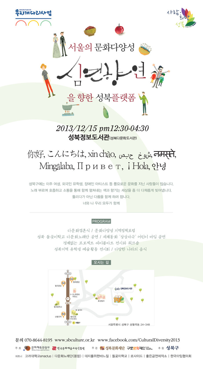 이에 올해 성북문화재단에서 진행한 다문화 노래단·세상의 모든 음식·세계동화 어린이 마임교실·유학생들의 아트 프로젝트·경계없는 예술 에이블아트 등 다섯 프로그램이 1년 동안 활동한 결과를 선보이며, 유학생 커플의 결혼식과 문화다양성 지역정책포럼이 진행된다.