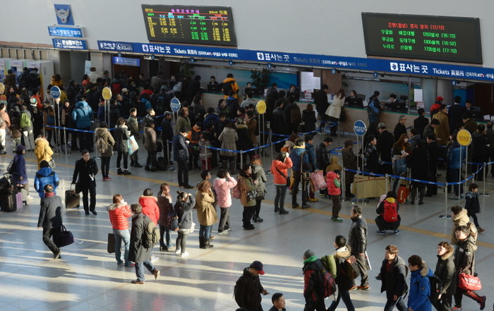 운행 중단 열차에 대한 안내가 나오는 가운데 13일 오후 서울 용산구 동자동 서울역 매표소 앞에서 시민들이 표를 사기 위해 줄지어 서 있다. 코레일은 오는 16일부터 새마을, 통근형동차는 현행유지하고 무궁화 10회 감축, 누리로 12회 증편운행하기로 발표했으며 수도권전동열차는 주중 178회 감축(낮시간대 위주), 화물은 6개 열차 증편 운행하기로 했다. KTX는 오는 17일부터 주중/주말 24회(주중 대비 12%) 감축 운행 할 계획이다. /뉴시스