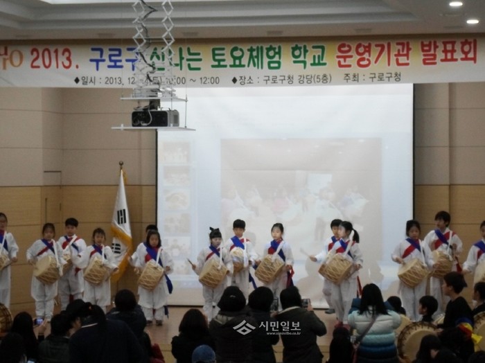 [시민일보]지난 14일 서울 구로구청 5층 강당에서 '신나는 토요체험 학교' 운영 성과 발표회가 열렸다. 이번 발표회에는 학생, 학부모, 토요 프로그램 운영기관 관계자 등 200여명이 참석한 가운데 진행됐다. 사진은 발표회 중 사물놀이 공연을 펼치고 있는 학생들의 모습.