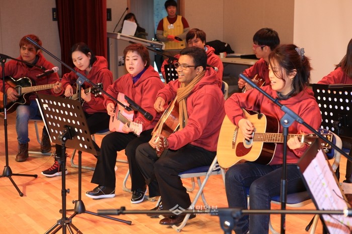 [시민일보]지난 15일 성동구청에서 지역내 외국인근로자들을 위로하기 위해 '아시아 포트럭 파티'를 주제로 '2013년 성동외국인근로자센터 송년잔치 및 발표회'가 열렸다. 사진은 이날 행사에 참여한 외국인 근로자들이 그동안 연습해온 한국어 노래를 부르는 모습.