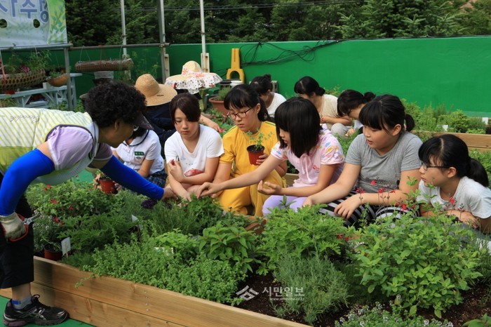 | ▲ 성수1가 제2동 주민센터가 지역내 유휴공간을 활용해 만든 허브농원을 찾은 주민들이 허브 체험행사에 참여 중인 모습. 허브 농원에서 발생하는 수익금은 소외계층 배려사업에 쓰이고 있다. | ||