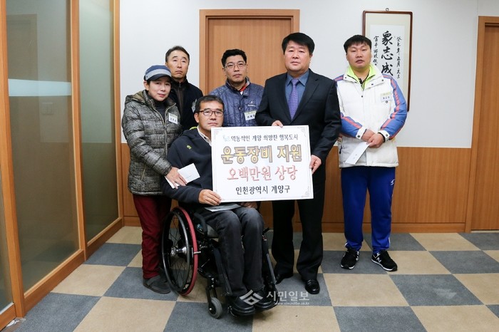 [시민일보]인천 계양구는 17일 지역내 거주하는 장애인 체육선수 중 전국대회에 출전해 입상경력이 있는 우수선수 5명에게 500만원상당의 운동장비를 기증했다. 운동장비를 기증받은 선수는 휠체어테니스 종목의 김승진, 조영실 선수, 사이클의 이용인 선수, 탁구의 김광진, 유근상 선수이며 선수들은 각각 테니스라켓, 사이클롤러, 탁구라켓 등을 기증받았다. 사진은 박형우 계양구청장과 선수들의 모습.