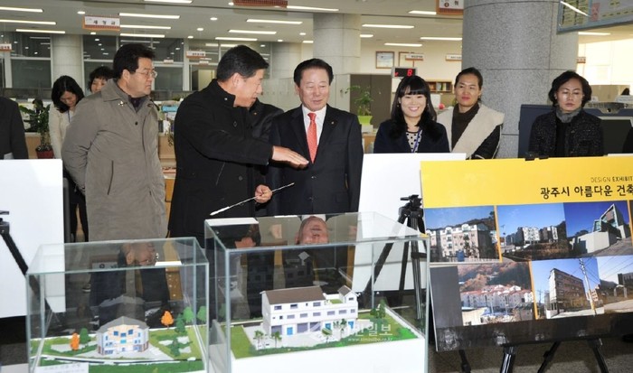 [시민일보]경기 광주시 청사에서는 내년 1월5일까지 올 한해 건축디자인 자문회의를 거쳐 선발된 우수작품 12점과 옥외광고물 허가를 얻은 간판들을 전시하는 '우수 건축디자인전'을 연다. 사진은 작품에 대한 설명을 듣고있는 조억동 광주시장의 모습.