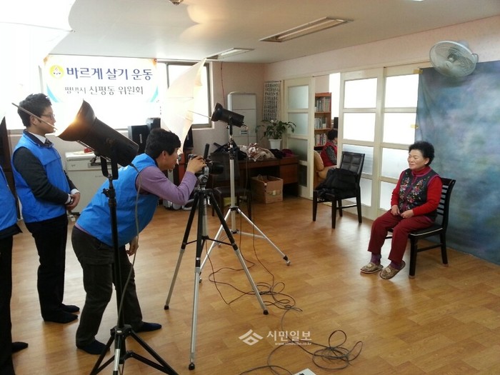 [시민일보]경기 평택시 바르게살기운동 신평동위원회가 지난 16일 지역내 경로당 노인 50여명을 대상으로 영정사진 촬영봉사활동을 펼쳤다. 촬영은 서종석, 조현국 위원의 재능기부로 이루어졌으며 영정사진은 보정작업이 끝나면 액자에 담아 내년 1월 중에 전달될 예정이다. 사진은 영정사진을 촬영하고 있는 모습.