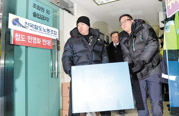 경찰이 17일 오후 서울 용산구 전국철도노동조합에서 압수수색을 마친 후 철도노조 사무실을 나서고 있다.
