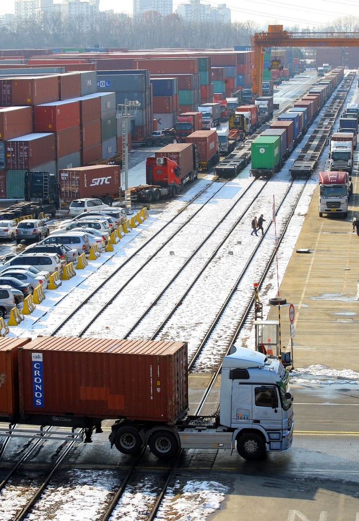 철도파업 열흘째인 18일 오전 경기 의왕 ICD에 컨테이너들이 쌓여 있다. 화물연대는 이날 '철도화물 대체수송 거부'를 선언했다./뉴시스