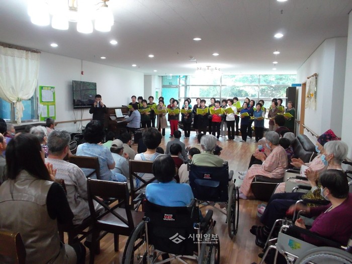 | ▲ 용산구 효창종합복지관의 봉사자들이 요양시설을 방문해 노래 봉사를 하고 있다. | ||