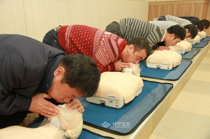 [시민일보]지난 19일 서울 구로소방서가 대한산업안전협회 중앙교육장에서 산업체 안전관리자들을 대상으로 재해 발생 시의 응급처치 방법 실습 교육을 실시했다. 사진은 인체 모형을 대상으로 심폐소생술 실습을 하고 있는 참여자들의 모습.
