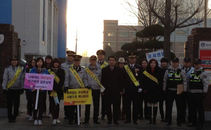 이날 캠페인은 피켓과 어깨띠, 홍보 전단을 이용, 경찰관과 학부모, 교사 등 30여명이 참여, 학교폭력 예방활동 및 청소년 선도·보호활동을 전개하고 학교전담경찰관 전화번호가 기재된 물티슈를 배부하며 SNS를 이용한 학교폭력 상담 및 신고에 대해 홍보했다.