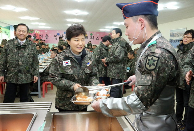 박근혜 대통령이 25일 강원도 인제군 12사단 신병교육대대를 방문해 훈련병들과 점심식사를 하기 위해 배식을 받고 있다.