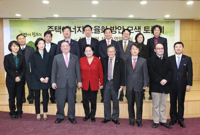 | ▲ 현대제철과 한국주거복지협회가 공동 주관한 '주택에너지 효율화 방안 모색 토론회'에는 토론회를 주최한 김동완 의원(새누리당·앞줄 오른쪽 네번째)을 비롯, 이재오·진영·강길부·강창일 등 25명의 국회의원이 참석해 많은 관심을 보였다./현대제철 제공 | ||